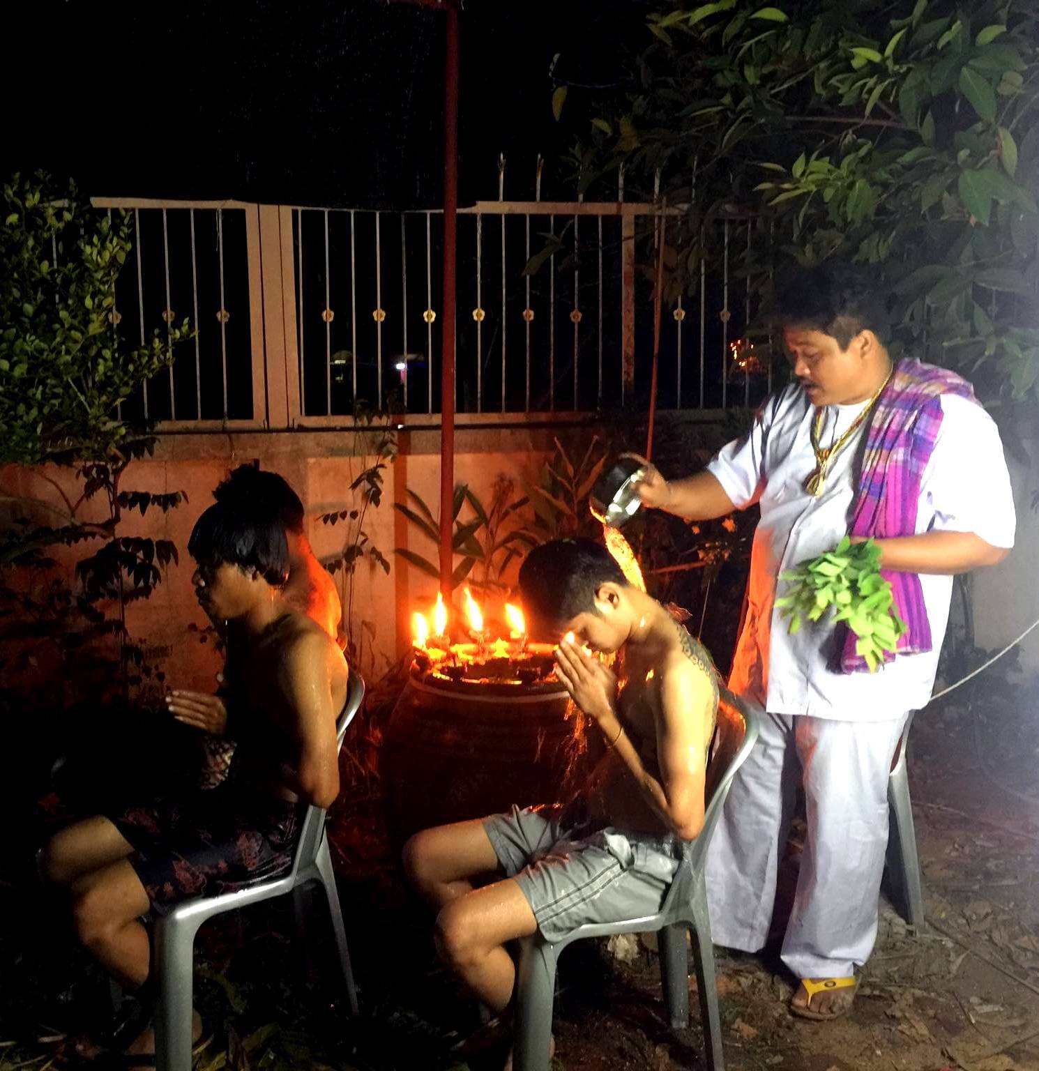Già nell’astrologia induista Rahu è considerato come un corpo celeste oscuro che rappresenta il materialismo, la malizia, la paura, l’insoddisfazione, l’ossessione e la confusione. Queste caratteristiche ereditate anche dal demone nero del buddismo thai, rendono i giorni dell’eclissi dedicati a Phra Rahu di cattivo auspicio. Per questa ragione molti Ajarn officiano dei rituali di purificazione nelle ore successive l’eclissi. Nel corso di questi rituali, come possiamo osservare da queste foto di Ajarn Nueng, viene benedetta l’acqua lustrale con la quale poi i devoti vengono lavati dalla cattiva sorte portata dall’eclissi.