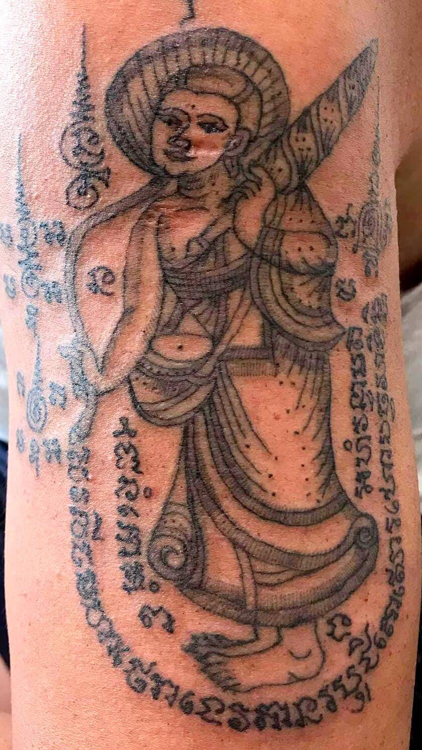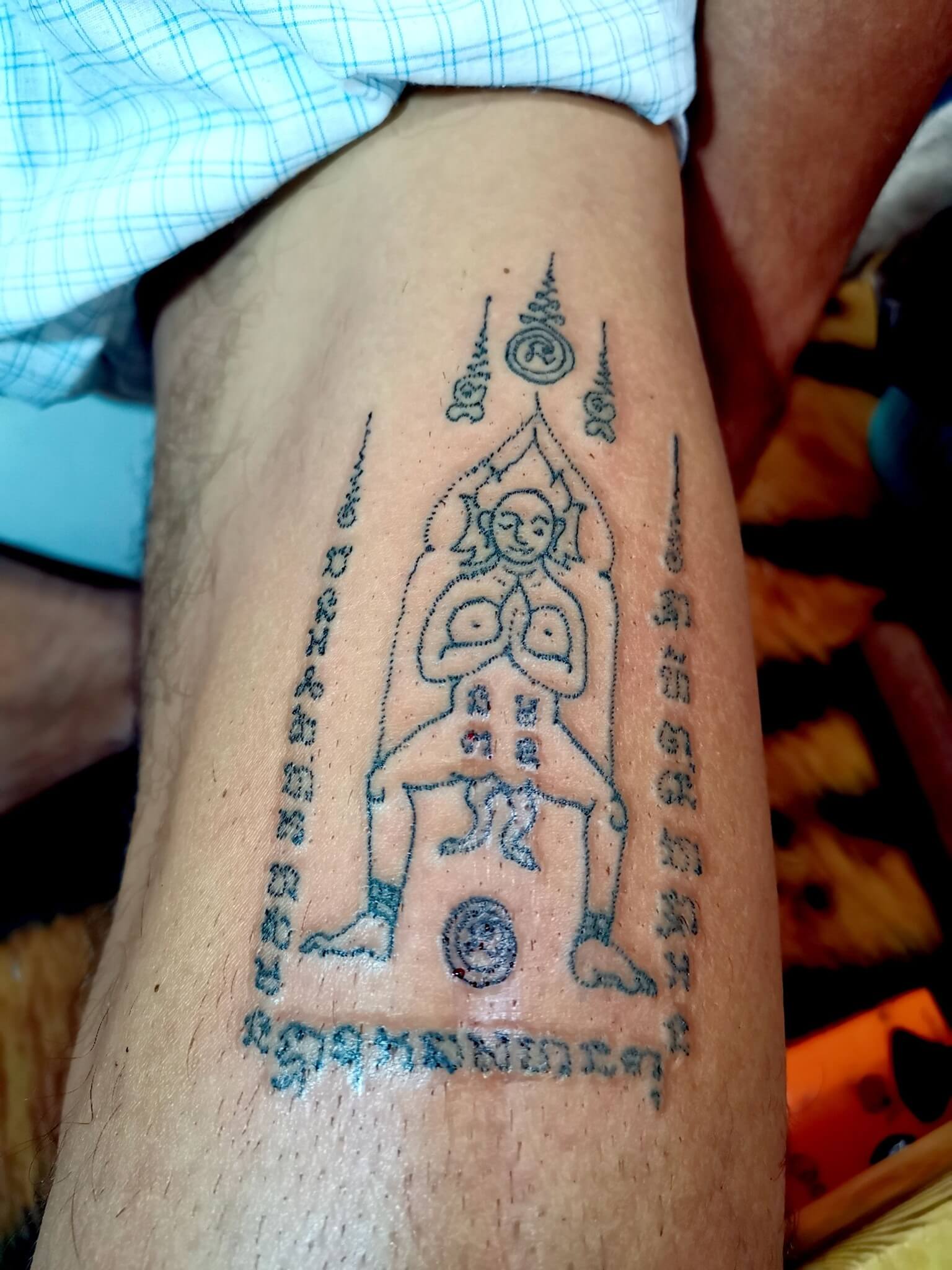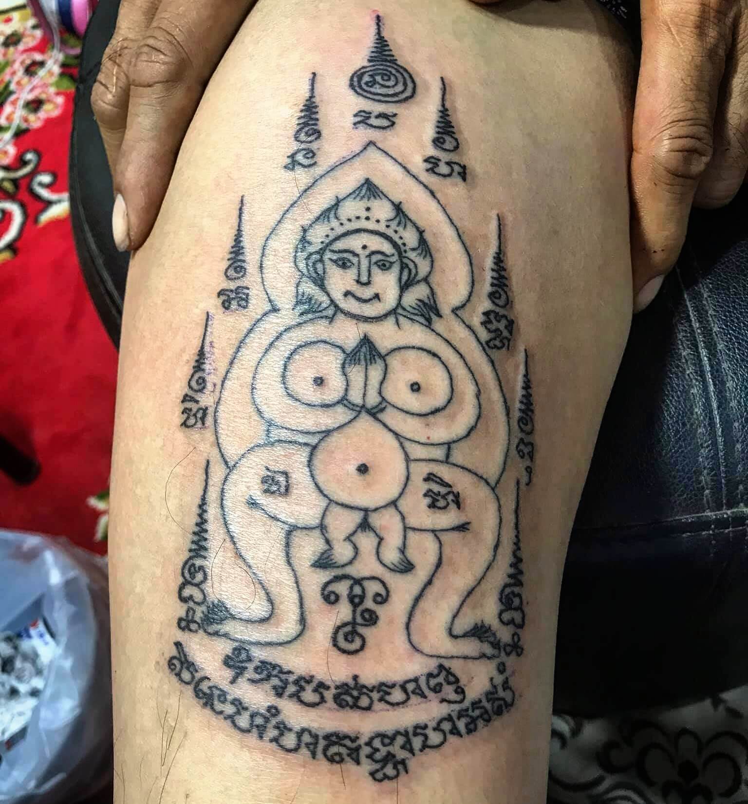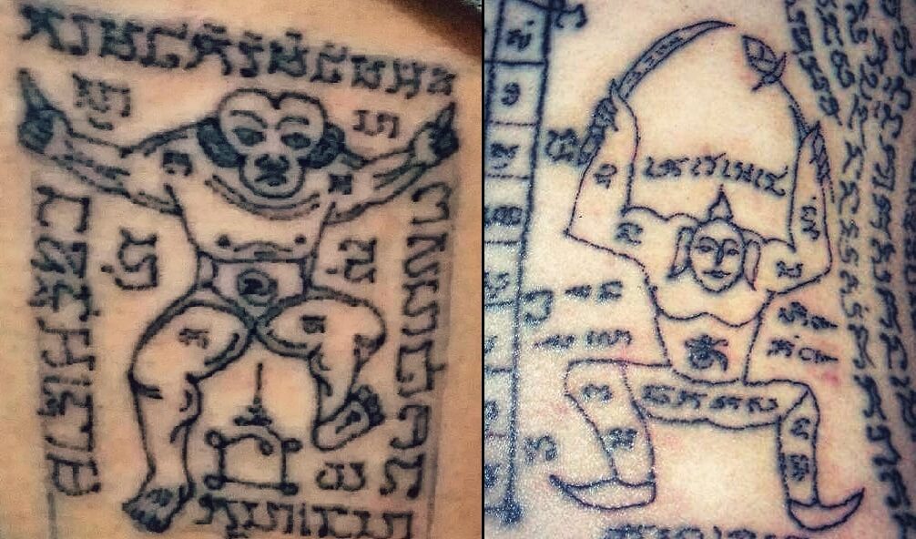 I due omini dall’aria malandrina sono rispettivamente, da sinistra verso destra: Dum Due, “il ribelle nero” e Daeng Gae Rae, “il vizioso rosso”, i due protagonisti di una favola/leggenda thai che racconta le animate vicende di questi due scavezza colli. L’ex abate del Wat Bang Phra, il venerabile Luang Phor Phern (colui che ha disegnato alcuni dei più celebri Sak Yant esistenti) disegnò i due personaggi prendendo spunto dalla loro storia realizzando due Sak Yant talmente carismatici che, secondo le credenze dei thai, non devono mai essere tatuati assieme per via del fatto che Dum Due e Daeng Gae Rae tendono a combattersi a vicenda. Averli tatuati assieme comporterebbe quindi numerose sofferenze al proprio portatore.