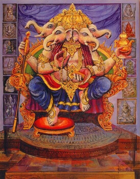 Per il gusto di indagare, ci siamo presi la briga di analizzare anche la pang di Ganesh a quattro teste che, a seconda del modo nel quale viene raffigurato, potrebbe mostrare solo tre dei suoi quattro volti, il centrale e i due laterali, celando alla vista dell’osservatore il quarto volto posizionato posteriormente rispetto a quello centrale (proprio come nelle raffigurazioni del dio Brahma, il quale pur avendo quattro volti viene raffigurato con sole tre facce per la medesima questione visiva).